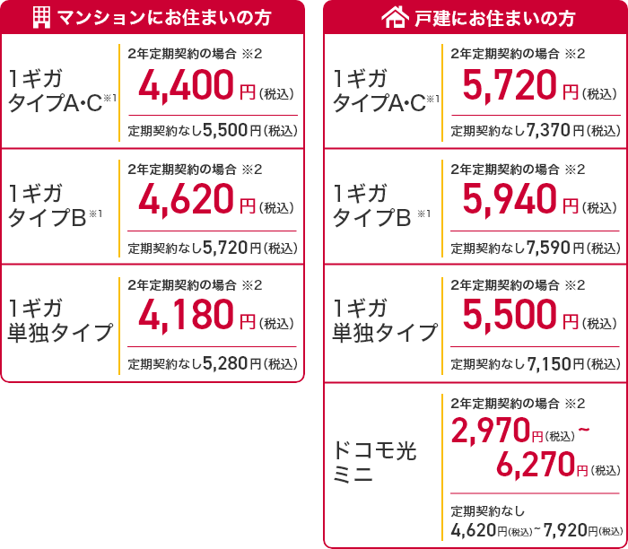 戸建タイプ5,500円、マンションタイプ4,180円、ドコモ光ミニ2,970円です。