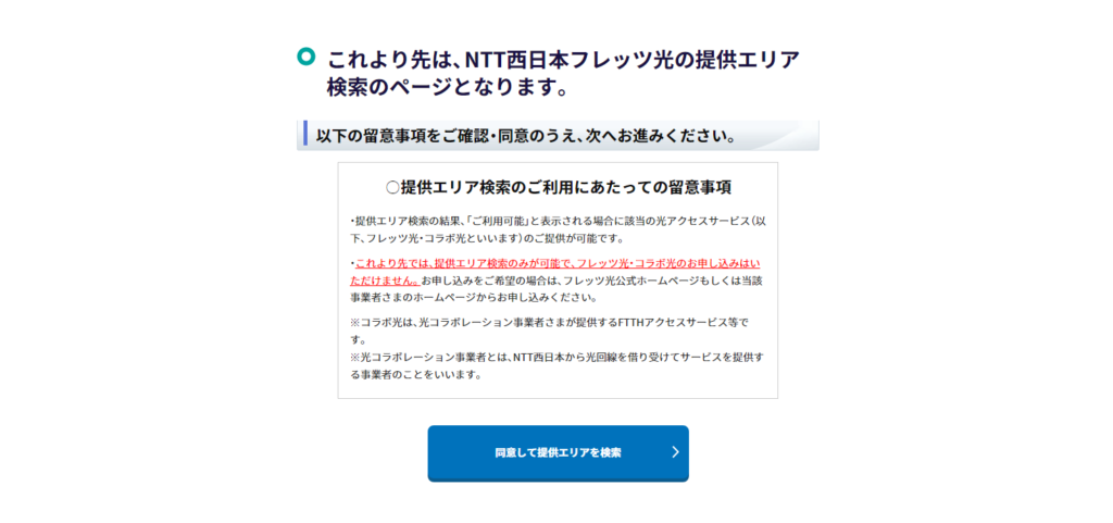 青いボタンの「同意をして提供エリアを検索」をクリックします。