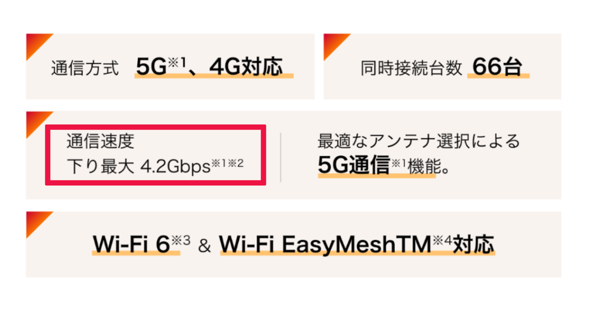 ドコモhome5Gは、5G対応で最大受信速度は4.2Gbpsなので高速かつ安定したインターネットが利用できます。
