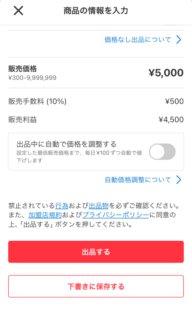 情報を入力し終えたら、「出品する」ボタンをタップします。