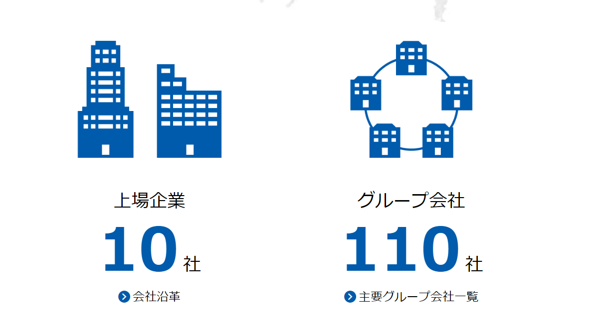 10社の上場企業と110のグループ会社、7400人以上の従業員で成り立っています。
