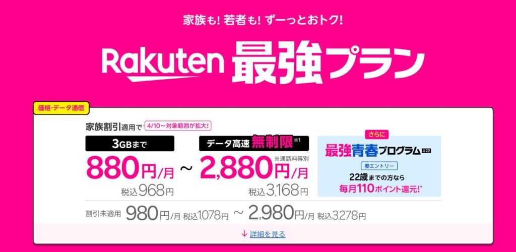 | 楽天モバイル | 3Gまで:1,078円 3G超過~20Gまで:2,178円 20G以上~無制限:3,278円 | 2.8Gbps | 無料 | 7,980円→1円 |