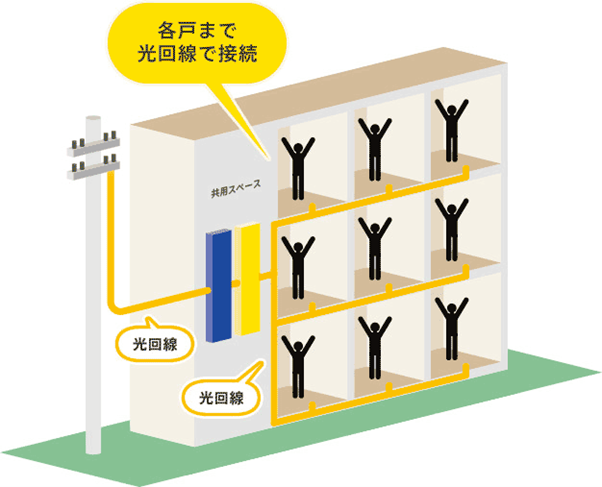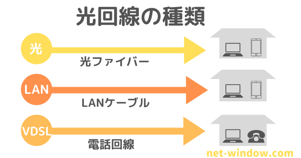 光回線は、建物に設置された光ファイバーケーブルは、3つのタイプで各部屋に接続されます。