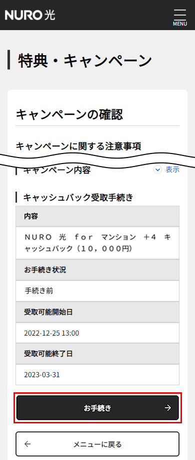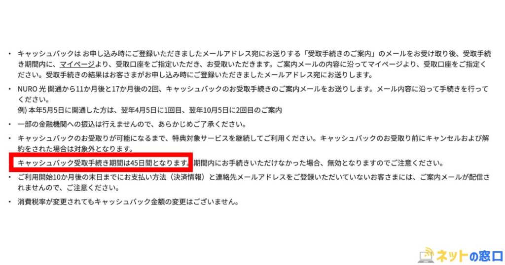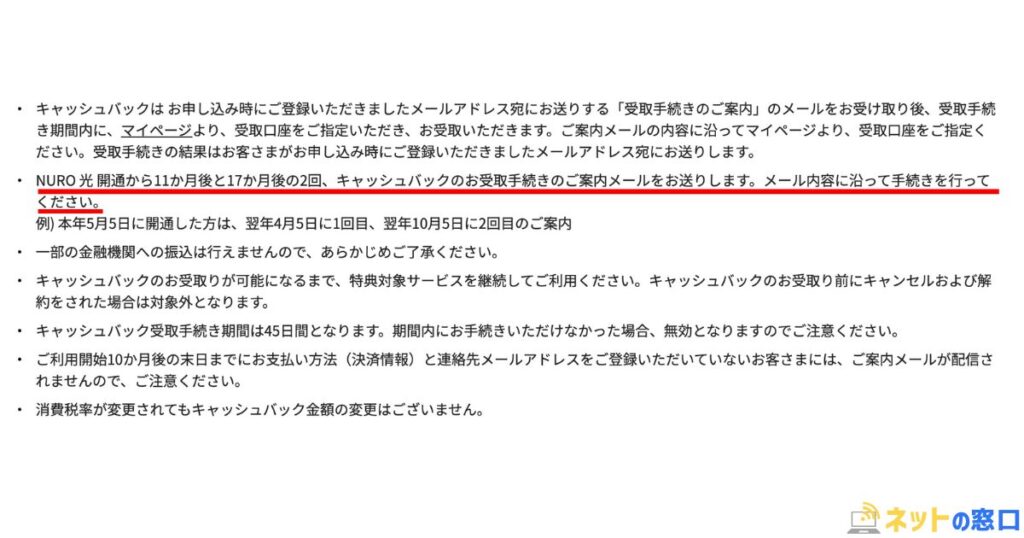 NURO 光キャンペーンの注意点一つ目は、キャッシュバック特典を受け取るには、申請が必須なことです。