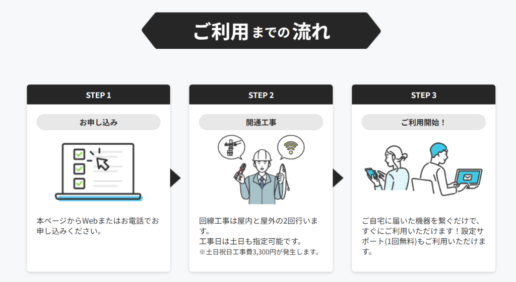 宅内工事と宅外工事をするので、2週間から2ヶ月以上かかる場合があります。