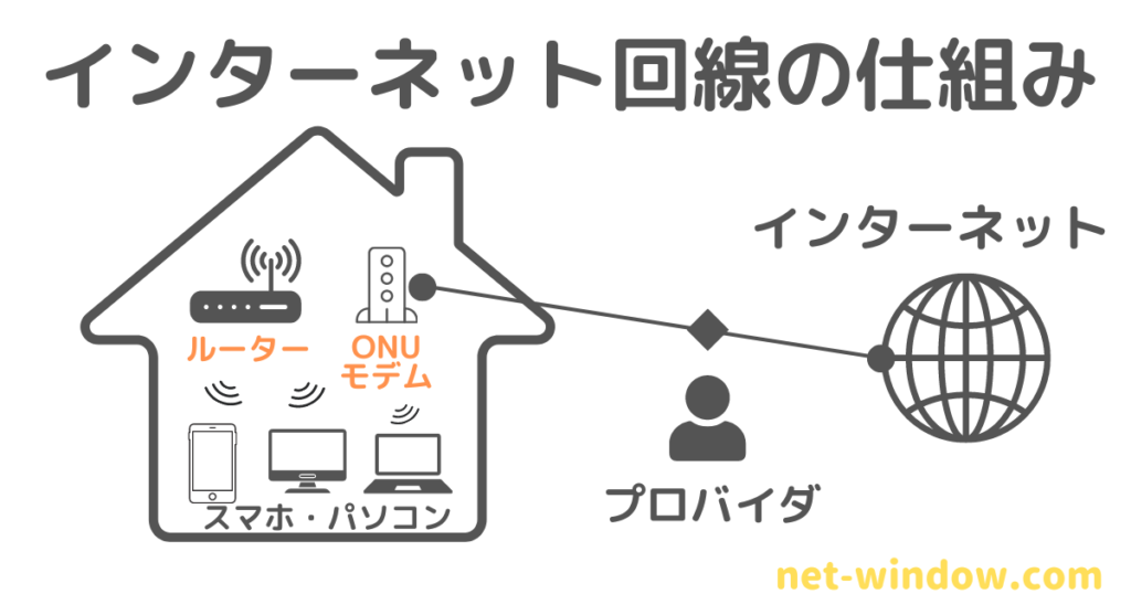 プロバイダとは、NTTやKDDIの回線設備にインターネットを接続してサービスを提供する会社をいいます。