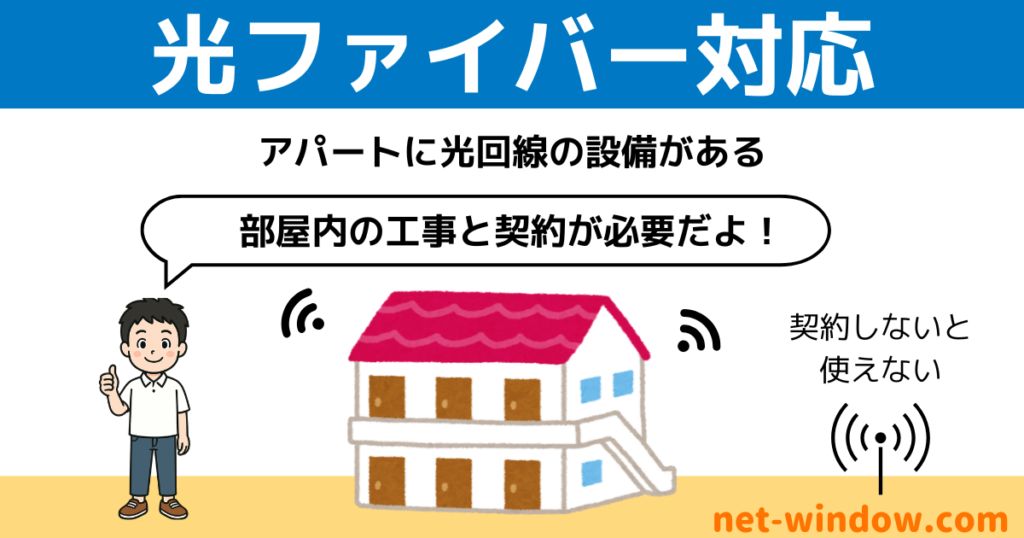 光ファイバー「対応」の物件は、自分の部屋に回線工事とプロパイダ事業者と契約の2つが必要です。