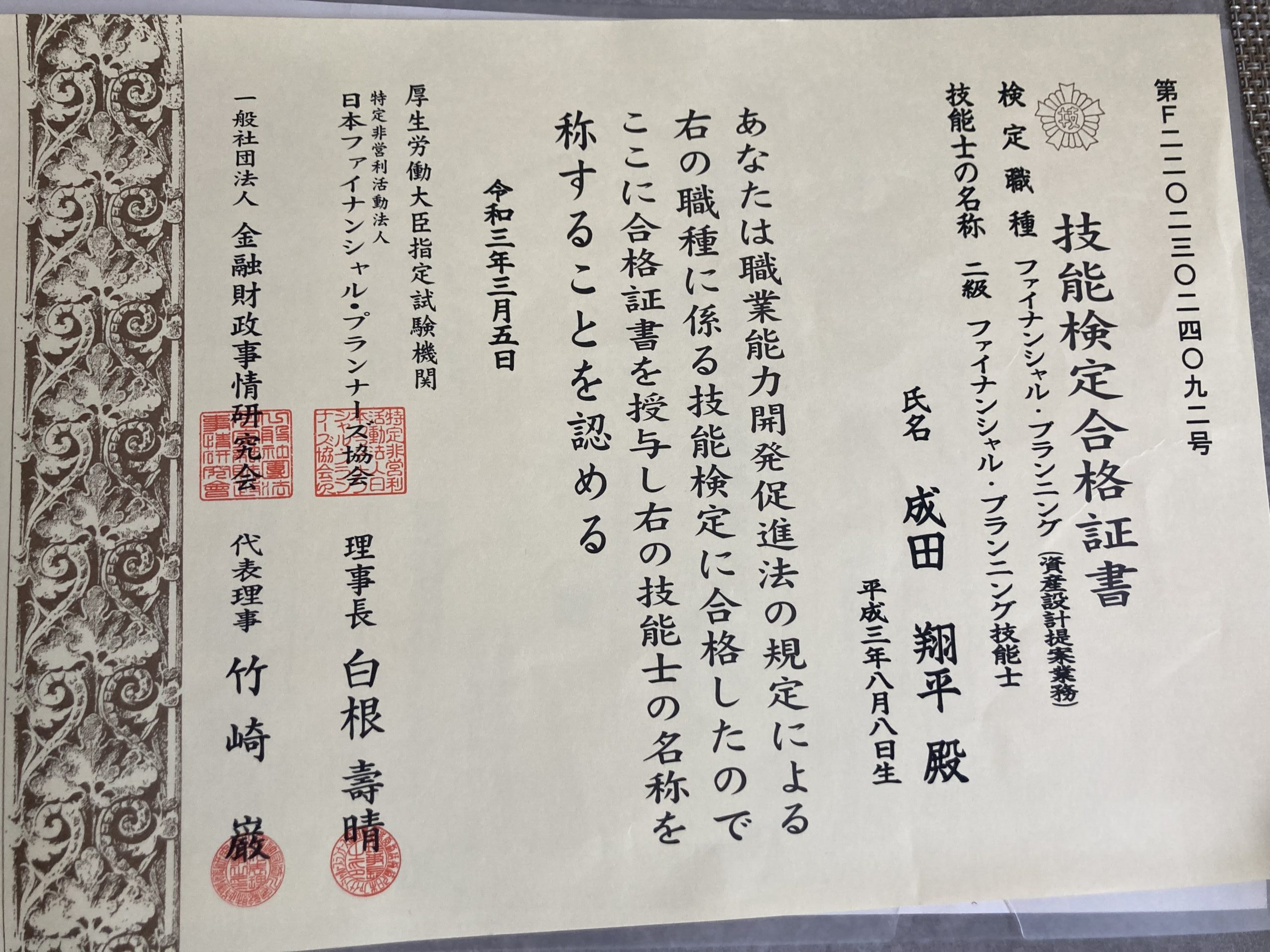 ![]() FP2級合格証書 | ![]() AFP認定証 |