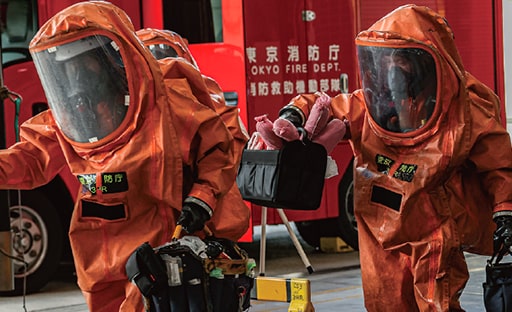 専門知識をもった隊員が高機能の資器材を使い、人命救助や危険な物質の特定、排除に当たります。