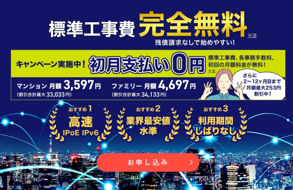 無料でルーターをレンタルできるので初期費用を抑えることができ、さらに回線工事も実質無料でできます。